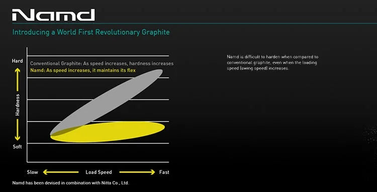 A world-first, new dimension graphite material, Namd, greatly improves the adhesion of the graphite fibers and resin by attaching nanomaterial directly to the graphite fiber.In high performance racquets, it is common to combine nanomaterials with resin that connects graphite fibers, but in Namd, nanomaterials are directly adhered to the graphite fibers and resin is greatly increased. This major improvement produces a shaft that flexes and stores energy, delivering explosive force on impact with the shuttle.